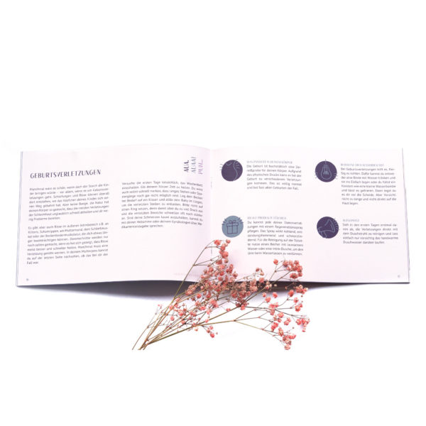 Herzstück unserer Box ist der Wochenbett-Guide, der dich durch das Wochenbett führt. Wichtigste Person an dieser Stelle: du selbst. Wir sprechen über Wochenfluss, Milcheinschuss & Stillen, Geburtsverletzungen bis hin zu Babyblues und Wochenbettdepressionen. Für den Fall, dass nicht alles wunschgemäß verläuft, zeigen wir wichtige Adressen und Kontakte zu externer Hilfe.